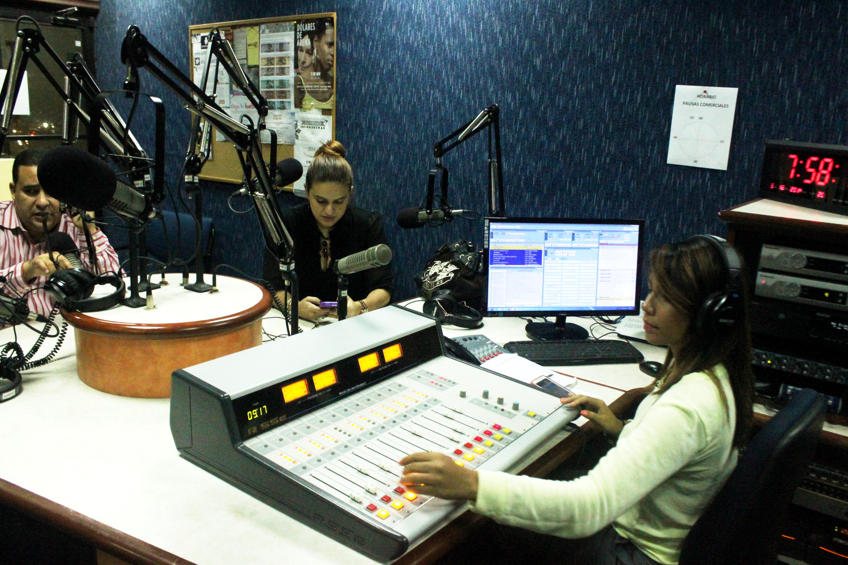 Cronometrada a su derecha por un reloj de grandes números rojos, se preocupa por respaldar a los productores y locutores. Cuando dice “¡al aire!”, abre los micrófonos y empiezan las palabras. Pero mientras, debe poner las camas musicales, los “bumpers”, los comerciales, y una que otra vez hasta se involucra en el guión. Hace de todo.