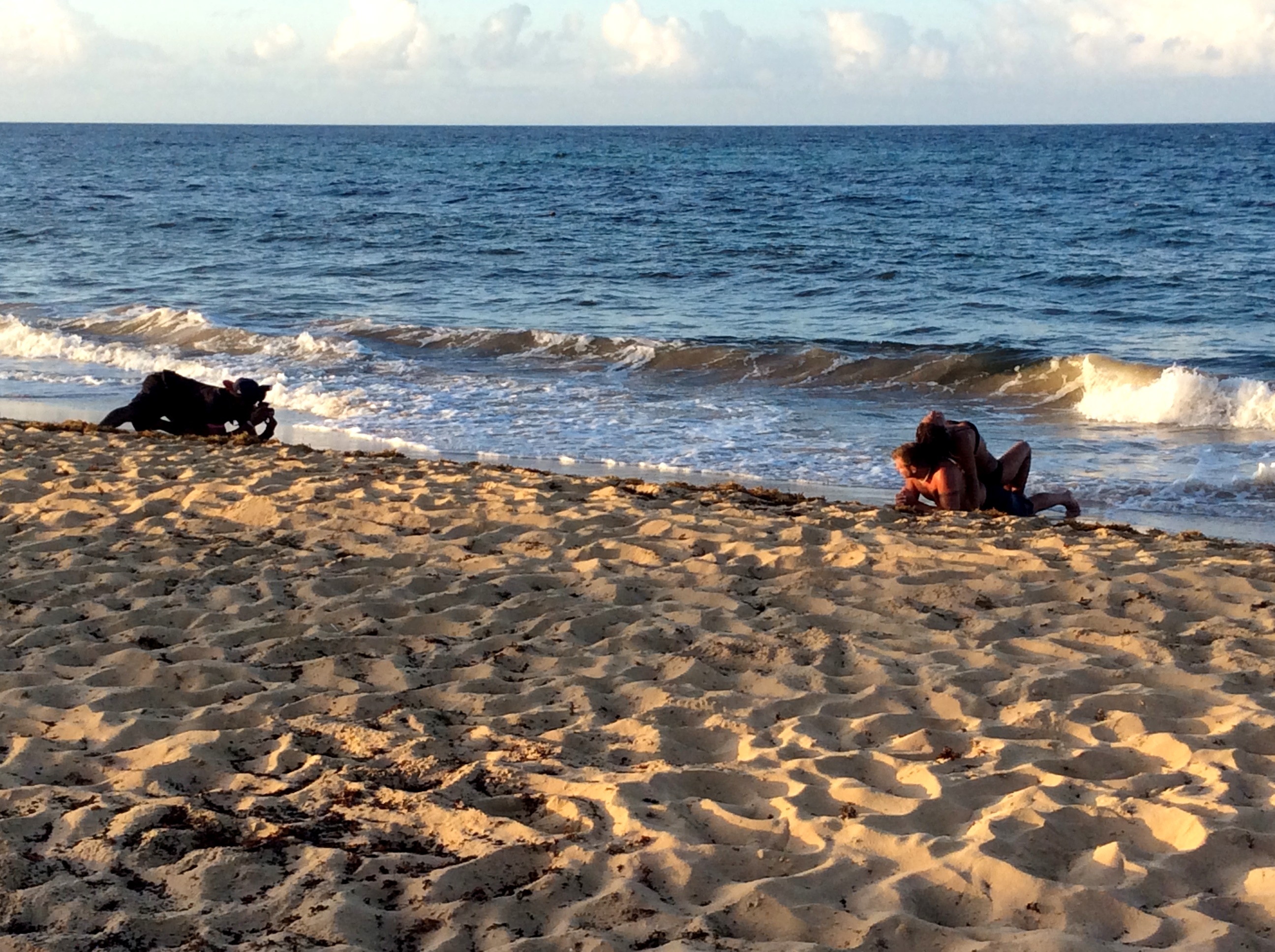Un día, una turista estadounidense lo motivó a que le hiciera una sesión fotográfica con su esposo. Asustado porque no sabía hacer fotos de ese estilo, se ayudó de un amigo para hacer los ajustes a la cámara. “Hice la sesión con miedo y amor”, recuerda. No sabía que retratar a estos adultos ampliaría su abanico de clientes, y desde hace dos años ya trabaja en cualquier escenario. Lo vi una tarde fotografiando el beso de una pareja que renovó sus votos matrimoniales en la playa del hotel.
